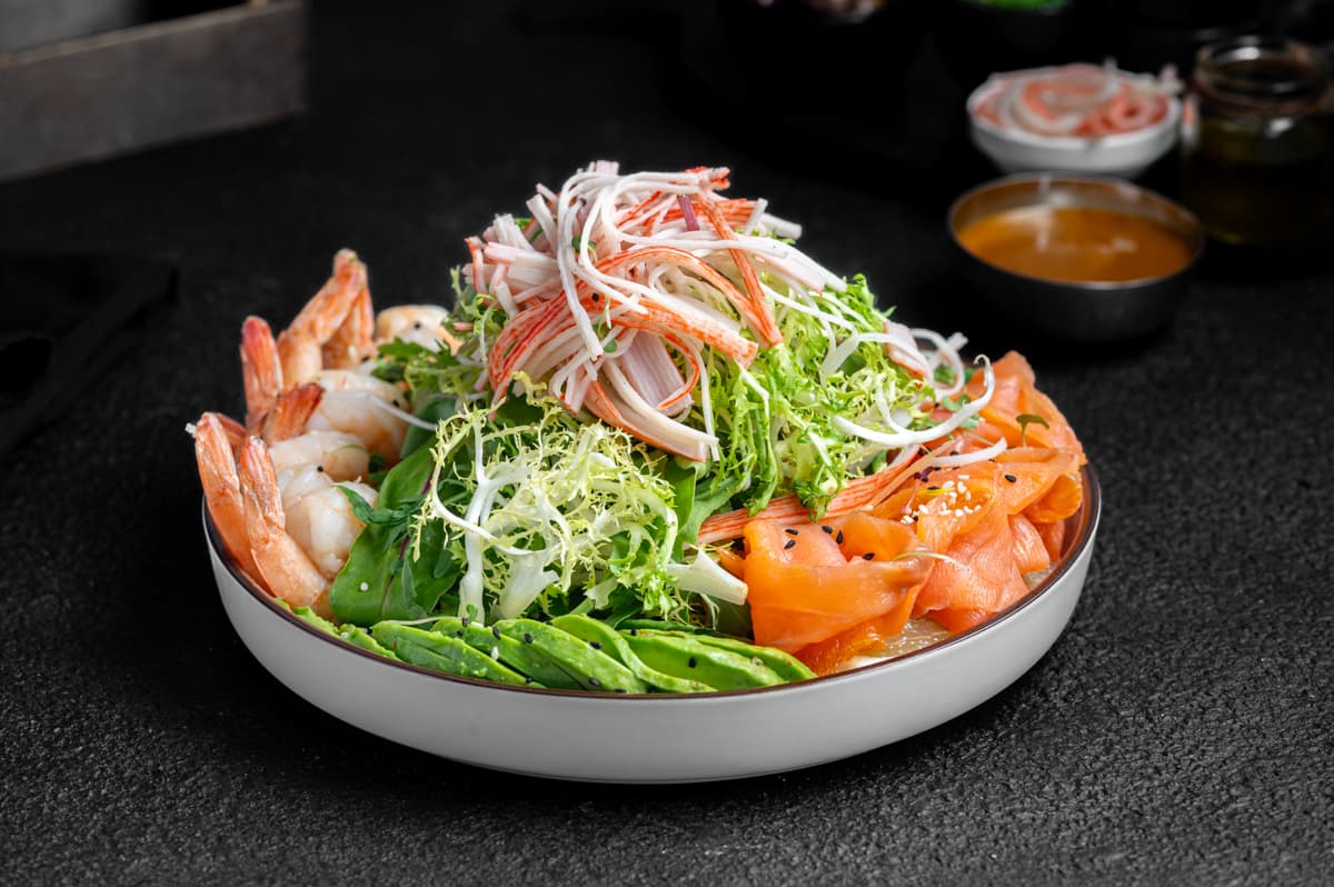 Mesclun Salad, Crab Sticks, Smoked Salmon Roses, Shrimps and Dill